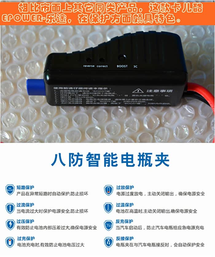 再看看这款具有八种防护功能的“智能电瓶夹”,我觉得此乃这款产品最大的亮点,功能十分强大,很多功能在别的应急启动电源上,可是没有见过的——可谓“大块头有大智慧”