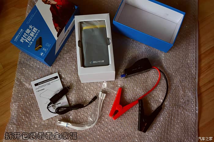 打开包装,露出了全家福,分别是:应急启动电源、说明书、车载点烟器充电线、USB一分三充电线以及智能电瓶夹。