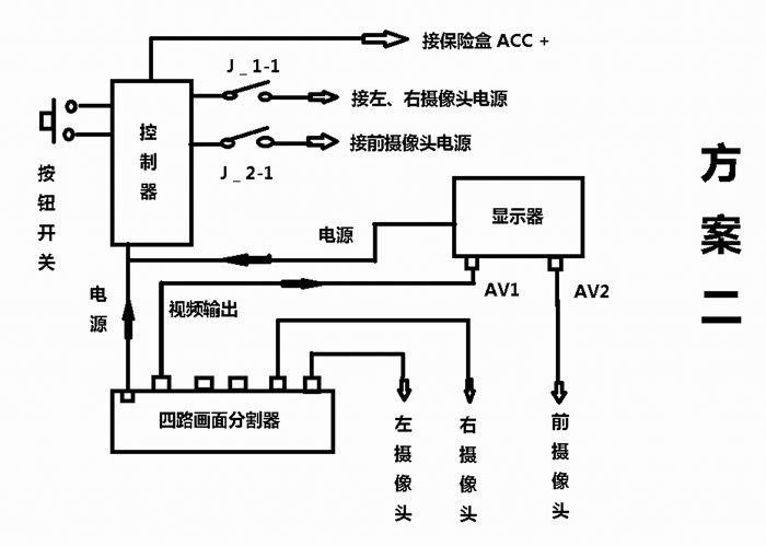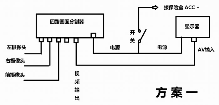 其中:方案一、方案二都需要购买一个四路画面分割器,方案二、方案三都需要制作一个开关控制器。三种方案中方案三是最为廉价的解决方案。