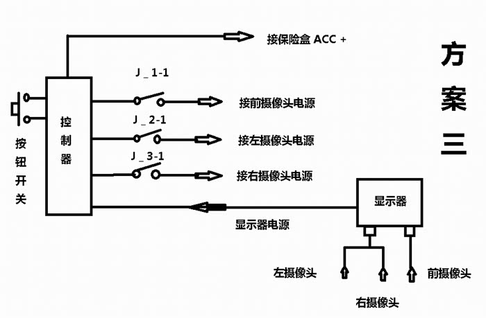 本来选择了方案二,也制作出来开关控制器且工作正常。但考虑到需要看前方和左右侧的时候需要按二次按钮,又选择了第一套方案。
