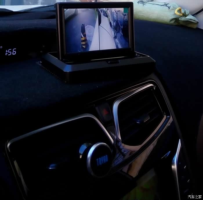 粘在出风口边上的按钮开关,抬手就可以按到。需要显示二侧的画面时,按下按钮即可(显示器有 1-2 秒的延迟)。