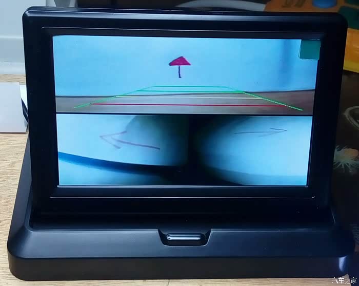 上图显示器中显示的是在 3 个 摄像头前的白纸上画的箭头。实验时前摄像头是从老车上拆下来的倒车摄像头,所以显示倒车线。