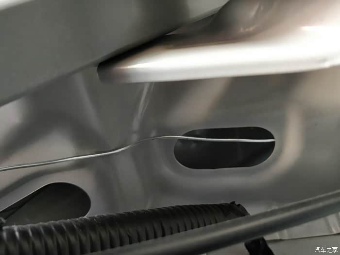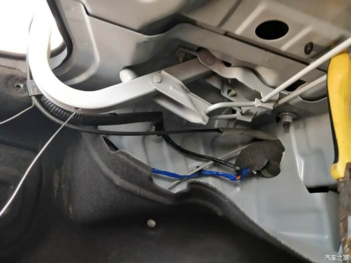 把胶垫弄开,看图位置,就能看到后备箱的光,穿铁丝就行了。