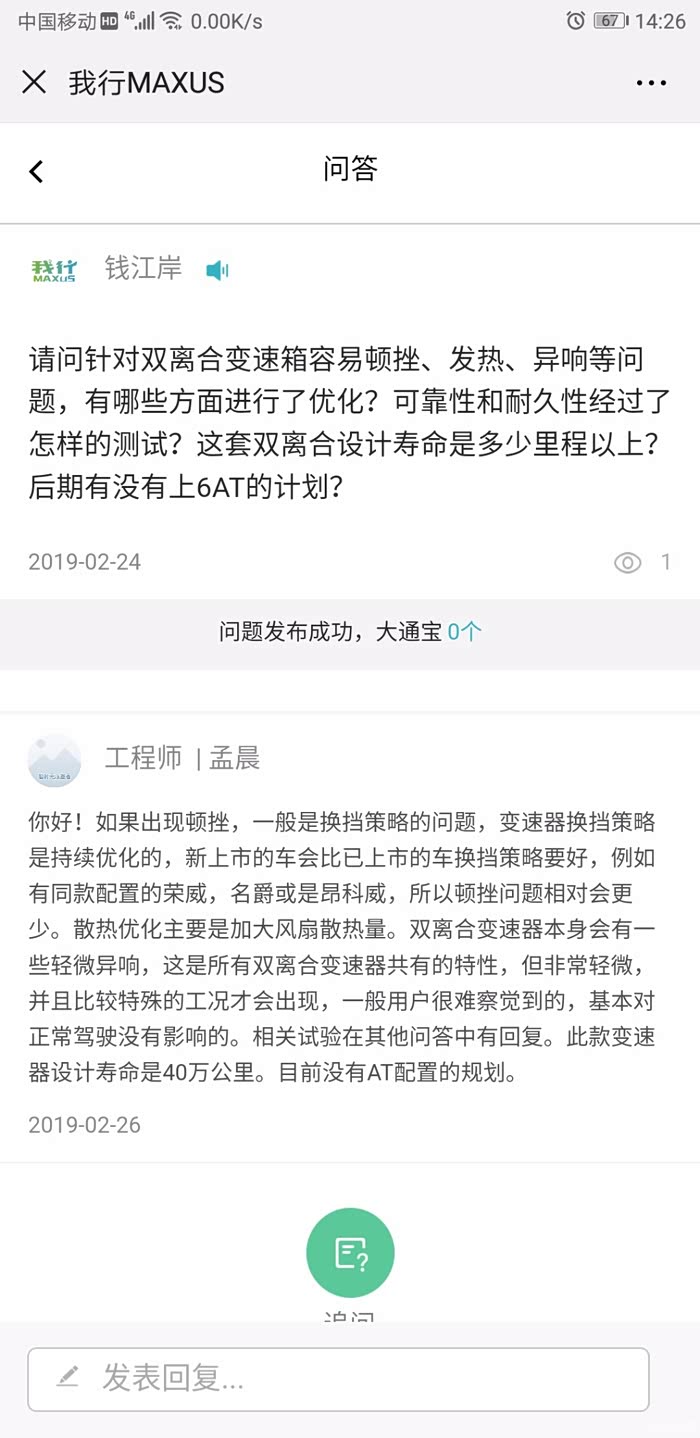大通工程师关于G50干式双离合变速箱的回答