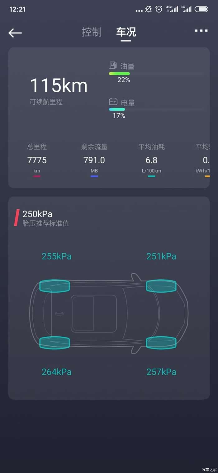 用户可查看车辆可续航里程、剩余油量百分比、剩余电量百分比、总里程、剩余流量、平均油耗、平均电耗、平均速度、胎压状态。(具体功能以车辆实际支持情况为准)。
