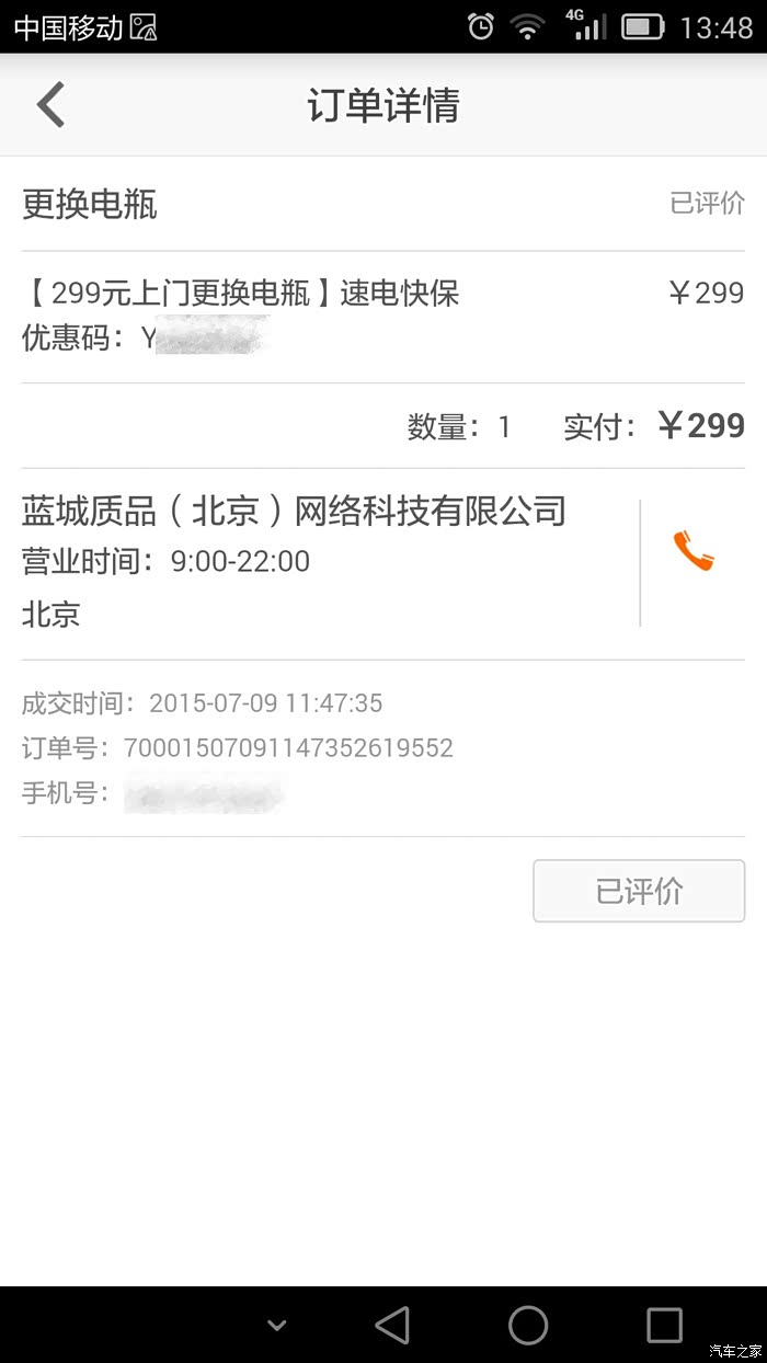 养车之家APP里的订单(电话和优惠码处理了一下):