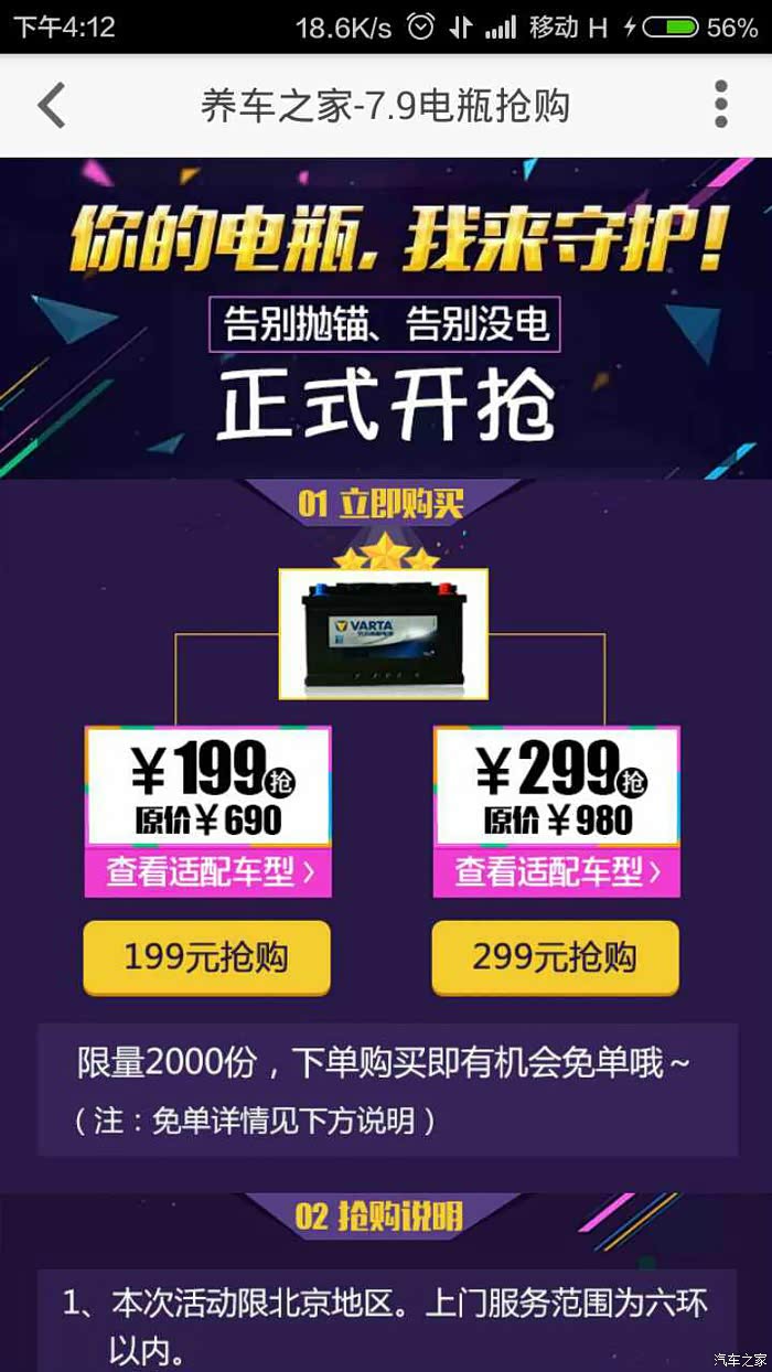正好前几天汽车之家旗下的养车之家APP搞活动,199,299电瓶活动(养车之家活动挺多,比如1块钱清洗机仓、更换空调滤芯等,大家可以装一个在手机了,随时关注着),当时电池还没有问题,但是我估计两年多了,差不多了,就想着先抢一个备着,然后等10月份再换,毕竟这么合适的价格(C5是299),不容易碰到(瓦尔塔某东将近600,老兵和老包也差不多这个价格)。