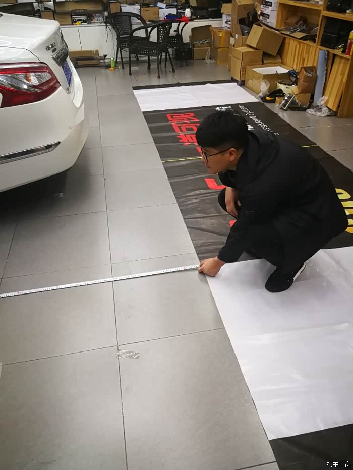 全部安装结束后,摆图量尺寸调节全车摄像头的距离,看上去还是很专业的。