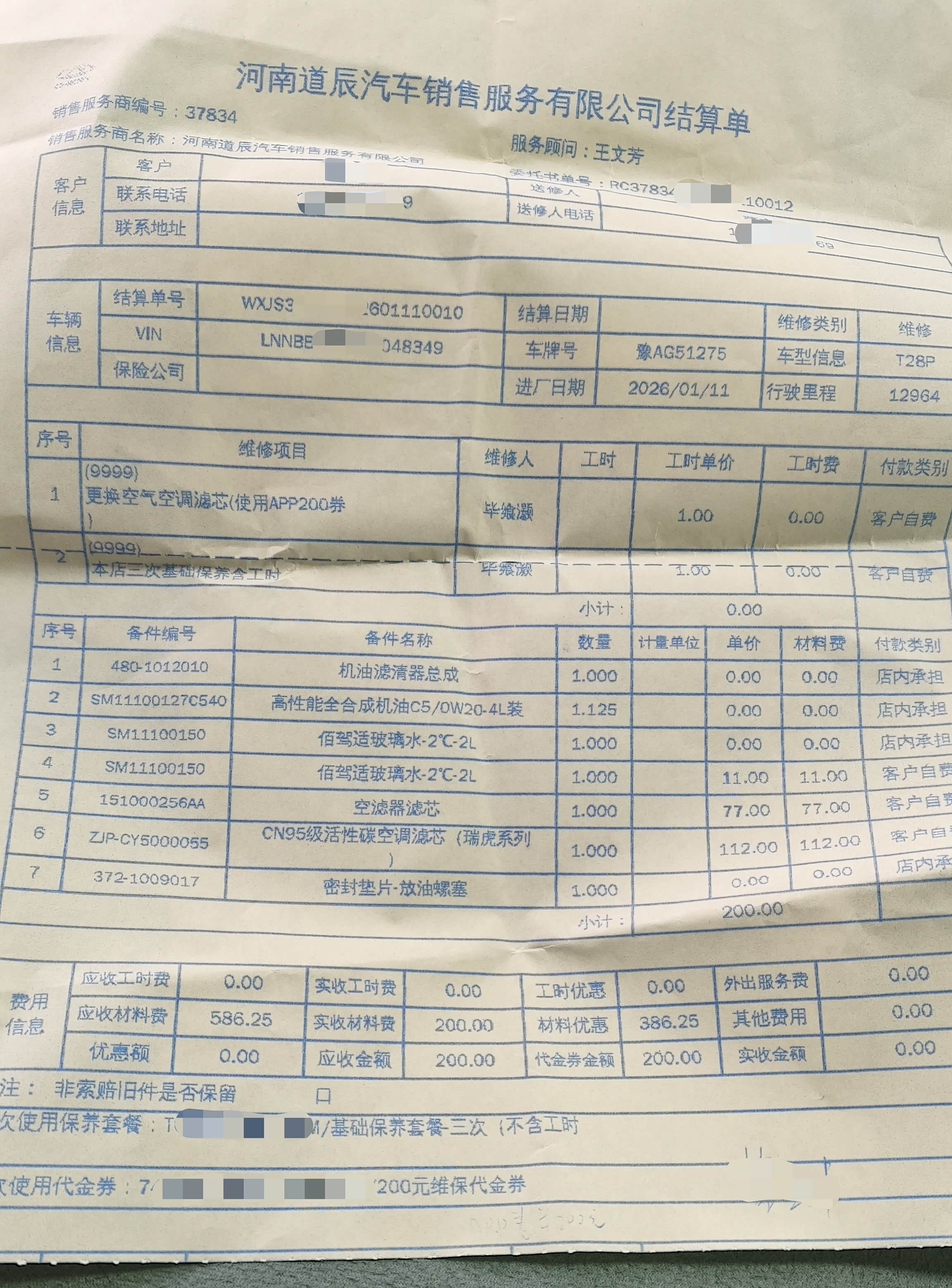 开了一年多风云T9,保养没花冤枉钱!