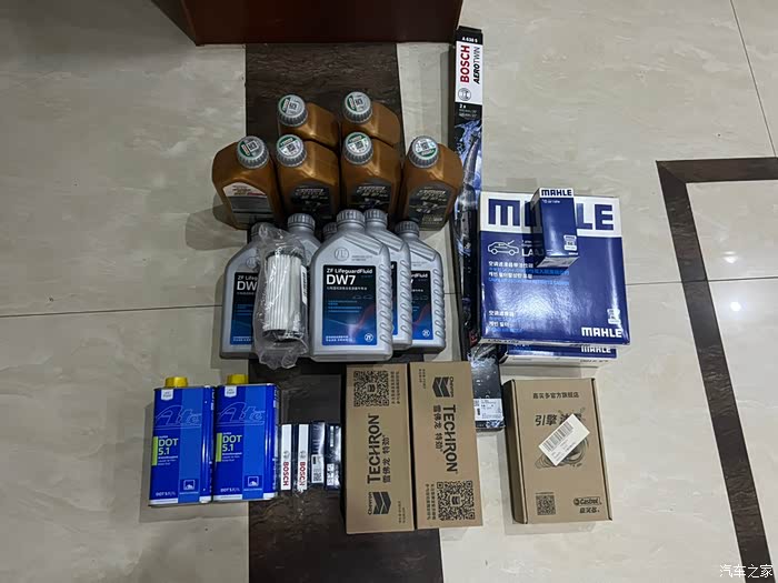 材料分别是:1,6升嘉实多超豪0W40机油及机滤。2,6升采埃孚DW7变速箱油及滤芯。3,马勒空调滤芯和空气滤芯。4,博世火花塞。5,博世神翼比利时产雨刷。6,大众原厂防冻液6升。7,2升ATE5.1刹车油。8,嘉实多清洗油和雪佛龙特劲470毫升燃油添加剂。