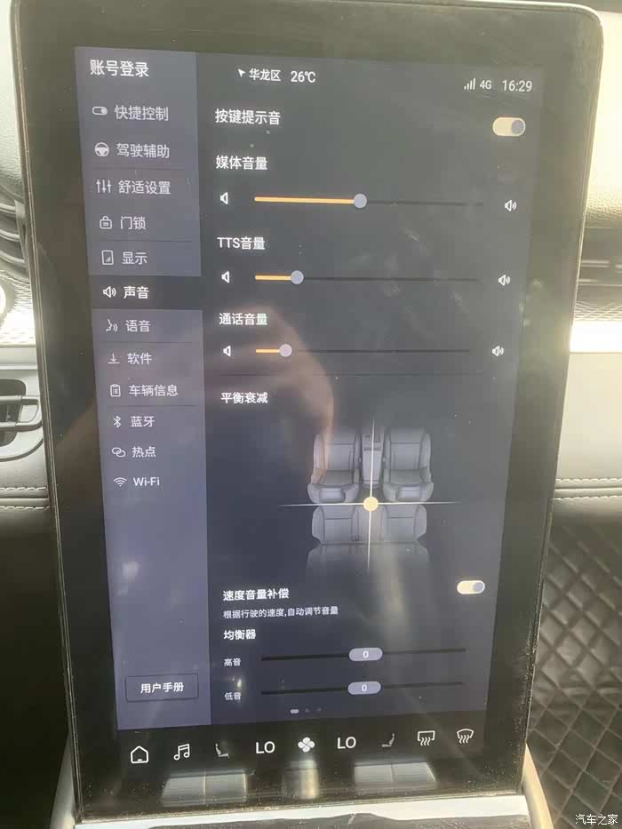 平衡衰减功能是一个很不错的细节功能,可以根据车内人员的喜好来设置声音的侧重点,例如前后、左右,设置后,不在范围区的乘客基本听不到广播或音乐的声音,非常适合家里有孩子的,孩子在后面休息,放歌曲不影响小孩睡觉。