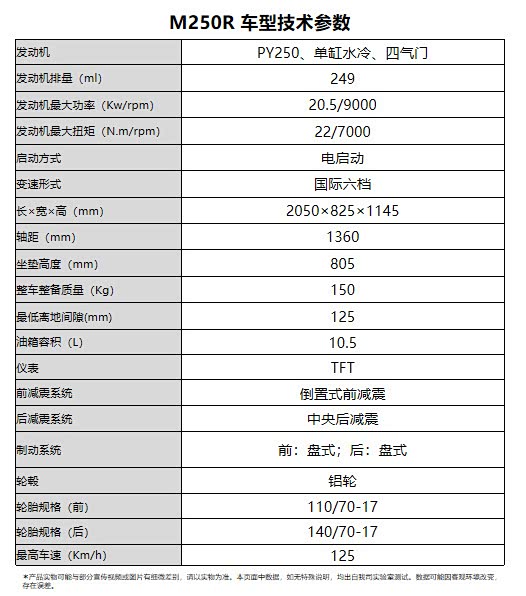 动力方面M250R搭载的这台发动机正是之前阿普利亚GPR250上使用的同款引擎,型号为PY250,这是一台实际排量249cc单缸水冷四气门发动机,具备最大功率20.5kW/9000rpm,最大扭矩22N.m/7000rpm,或许很多车友会觉得遗憾为什么不用双缸引擎,这只能说厂家在定位上也有自己的考量吧,好在这台引擎已经非常稳定。