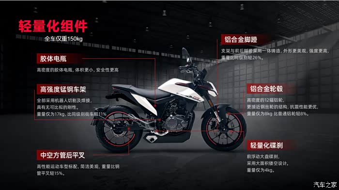 配置上M250R标配FCC滑动离合,双通道ABS,整车也采用了大量轻量化的设计,车身上也运用了大量的铝合金件,在较轻的整备质量下配合不错的引擎动力来获得更为灵活的操控体验。