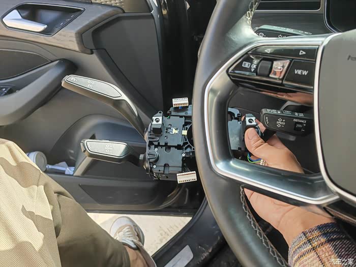 改装师傅先是小心翼翼地打开方向盘下护板,这个过程需要格外细心,以免刮伤周边的内饰件。凭借丰富的经验,精准地找到原装巡航手柄的固定螺丝,使用专业工具轻轻拧下,然后小心翼翼地拔出连接线束,将原装手柄完整拆卸下来。看着师傅们娴熟的动作,我也觉得安心不少。