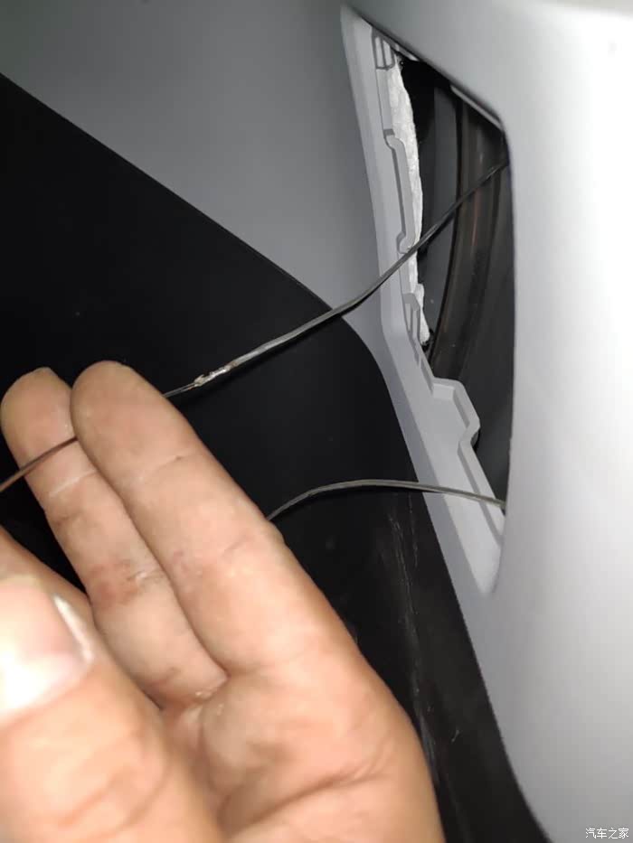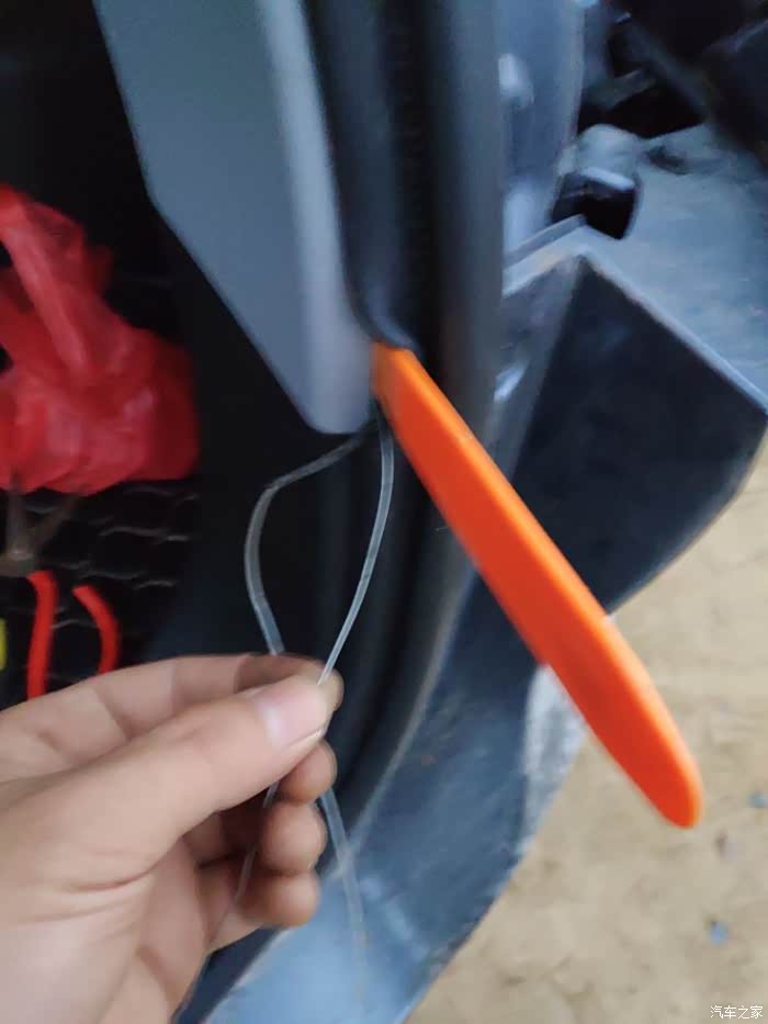 到这里也是要用铁丝穿,这些面板缝用那个红色的翘块很容易翘起来的,然后塞线进去,