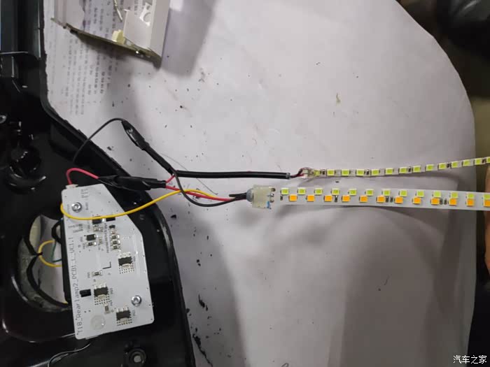 原来电路只要那两条线搭接,电板是不通电的 ,没用了。底下的灯我没改流水灯,只接黑线和红线(通电常亮的日间行车灯,只要打开夜间灯开关才亮的),接好线布好线,整体效果是这样的,