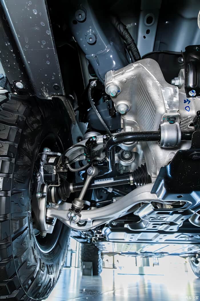 猛士M817采用前后双叉臂式独立悬架,前悬采用双球头虚拟主销设计,提升了极限位置阿克曼百分比,可随车轮转角增加而增加,增加回正性能、改善转向特性;全铝底盘重量同比降低30%,材料更耐腐蚀,提升续航的同时,驾驶平顺性提升了50%以上,减少了加速抬头和制动点头现象,同时更轻的簧下质量也加强了动态操控响应,沙漠冲坡效果更佳。