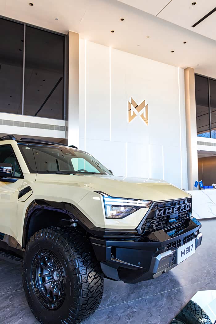 走进展厅,我远远看见它的时候,第一反应居然不是“凶”,而是“稳”。猛士 M817 的存在感很特别——不是吼叫式的霸气,而是一种沉默的力量。那种外观的线条,像是从岩石中劈出来的,有棱有角,却不刺眼;车身比例很挺拔,宽体姿态让它站在那里就像一个守护者。