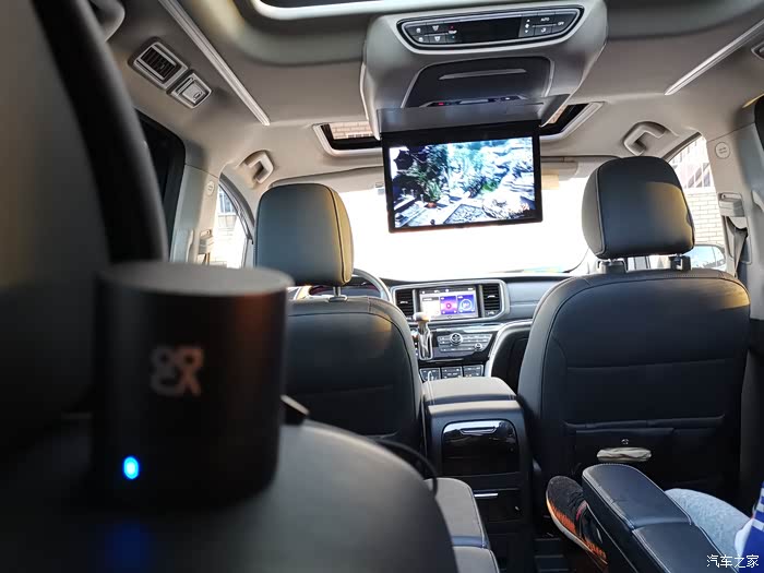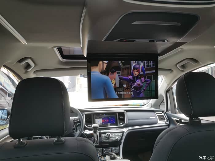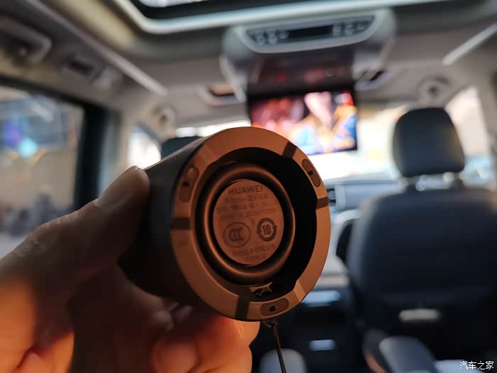 第一排天窗装一个15.6寸的wifi款吸顶电视,使用时连接自己手机热点,效果很好,可以看高清和蓝光视频没问题。但是存在一个问题,就是吸顶电视的音响在电视机本身集成,如果坐第三排的看,就会把声音调大,这样就相当于把一个喇叭放到了驾驶员的右耳朵旁边不到20CM的地方,一是比较吵,二是视频内容精彩时驾驶员也会受到视频音效影响,容易造成分神分心,很不安全。自己想如何解决呢,最简单的方法,就是在第三排放个蓝牙小音响,因为这款大篷车吸顶电视是可以连接蓝牙设备的,包括蓝牙音响,这样声音从第三排音响发出来,坐二三排的听的清楚,还不干扰驾驶员,也免去了布线和改装的问题,更不需要去改装店,自己花100元不到买个华为、小米的蓝牙音响即可搞定,尤其是华为蓝牙音响支持双音响,第三排置物盒或水杯槽里各放一个,重音和立体声都很棒!
