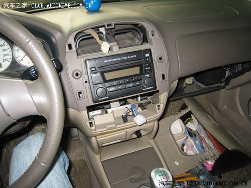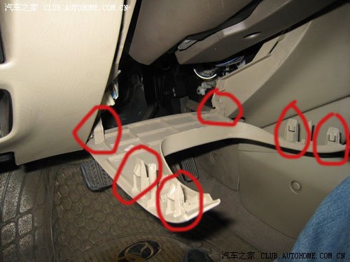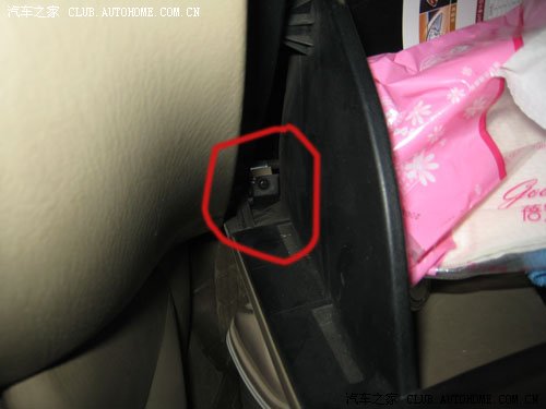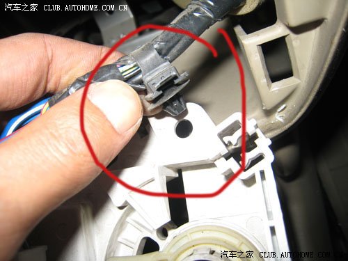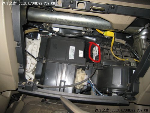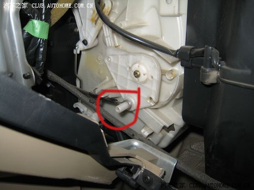 这是取下手套箱后的样子,右上方发现第一根拉线,空调内外循环用的,小心将拉线头取出,注意拉线头处有个塑料扣,不要伤了塑料座,然后把线从用于固定拉线的一个钢片弹簧夹中取出