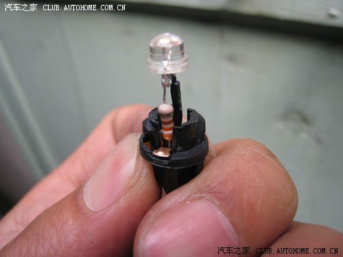 由于事先不知道灯泡型号,没有事先准备灯泡(拆开后才发现是T5型号的,同学们可自已选购T5的LED装上,直接替换原灯泡,很方便),只有自己DIY了,找了块电路板上拆了几个白光的LED和电阻,用烙铁焊死在底座上