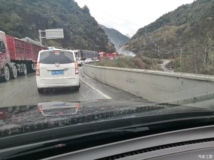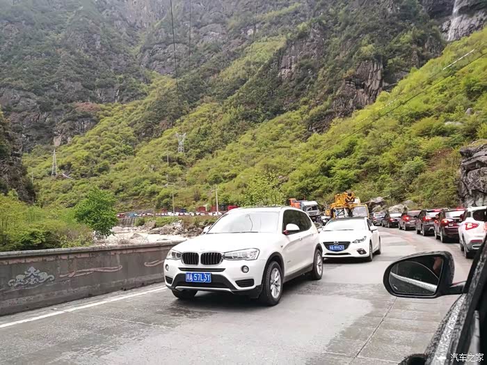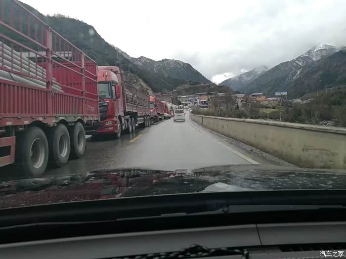 我们从折多山下山一路都是排队等候上山的车辆,去西藏就G318这一条路最近路况最好,有的大车司机已经在这里等了三天了。今天正值五一假期第一天,出来玩的车也多,这个队一直排到康定市外排到大河沟村,我也不知道有多少公里,反正感觉这辈子第一次见到这么长的滞留车队!