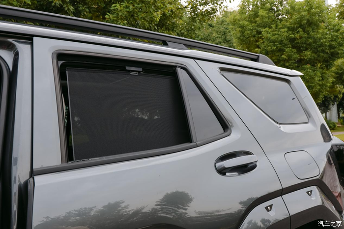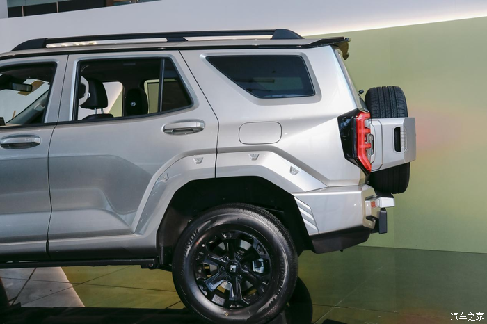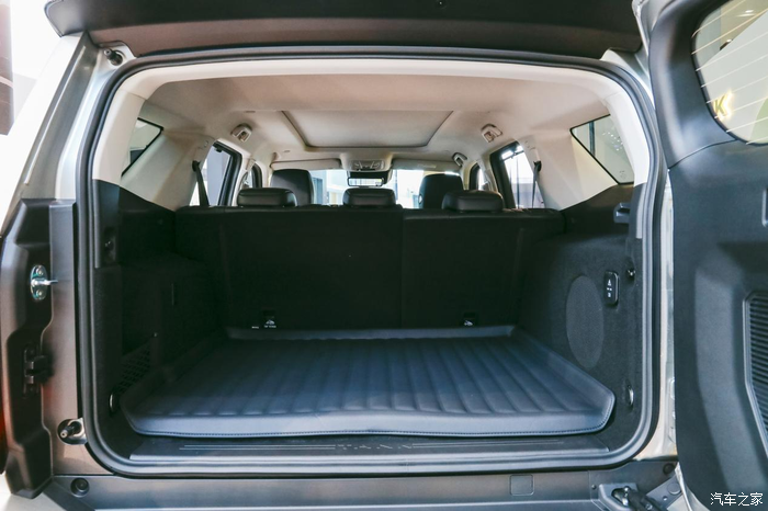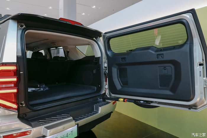 后备箱是平开的,后面背着一个全尺寸的备胎,越野车的标配,外出穿越,或者长途自驾游,有一个备胎,多一分安心!