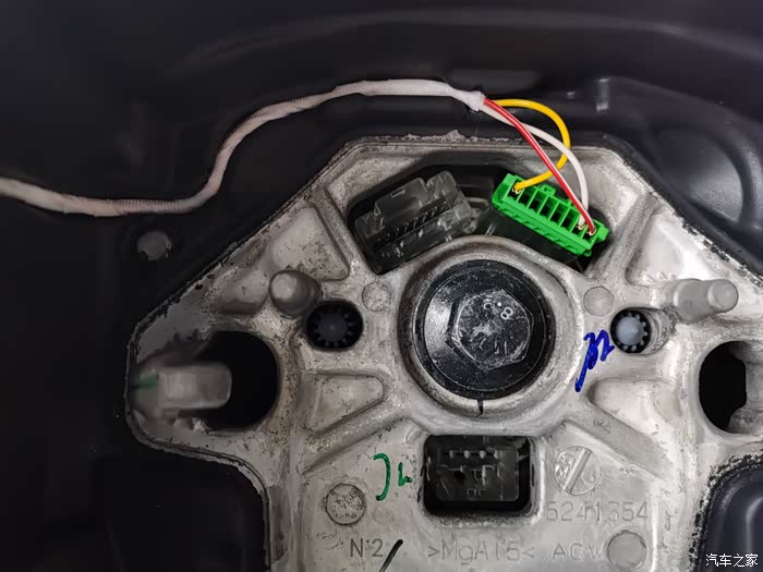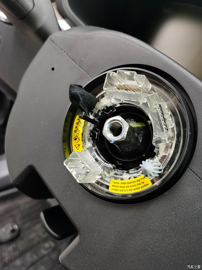 换新按键之后,方向盘有塑料件碰撞的声音,然后重新拆开,在图片所示的灰色塑料件上缠绕了特有的胶带。维修小哥哥说这个位置异响,也算是沃尔沃的通病,小毛病。