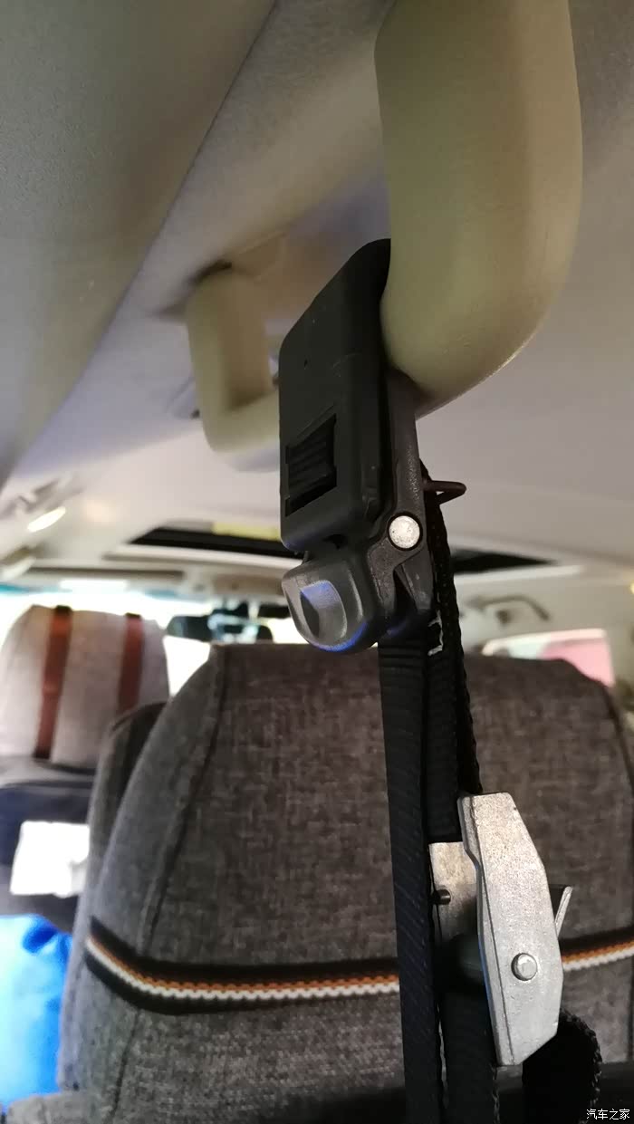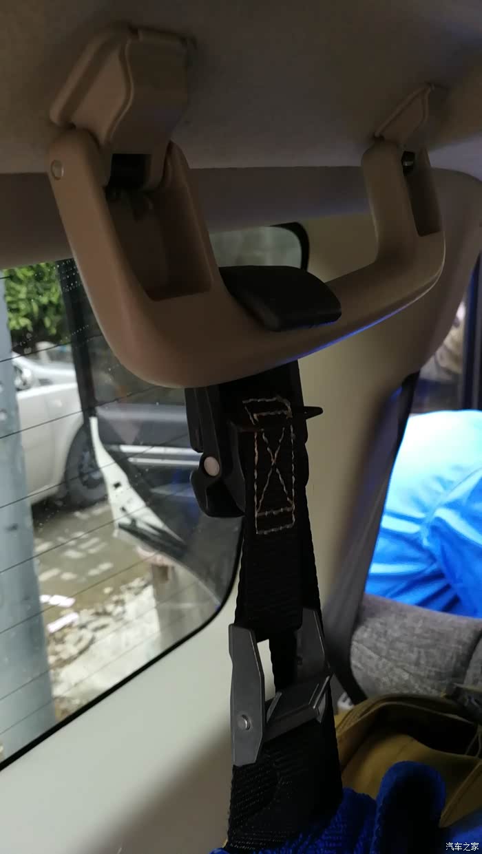 后背胎内置,有点像第一代国产切诺基那样,不过,我不是用的车体上的支架,也舍不得样内饰板上打支架,我用了轮胎店朋友给的轮胎展示架做底部固定,上面用单向锁紧带,再借助原来老车上扔掉第三排座椅的钩子,挂在第三排扶手上,轮胎中间再用带钩子的捆扎带,拉在地锚勾上,完美,不晃动!后备箱备胎壳里面装个假备胎,后门好轻啊!