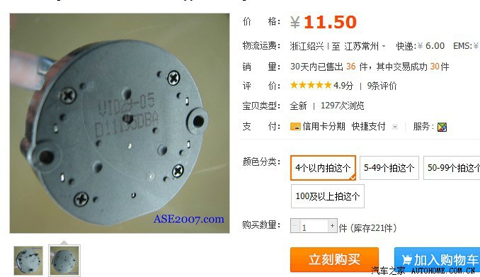 上淘宝,此电机买4个以下时,每个11.50元,不算邮费的话,正好是4S店1150元价格的100倍。于是网上下单,买了一个。