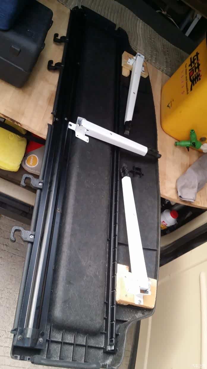 遮物板(隔物板)上场。这时前后座的空隙,刚好由遮物板来填充。遮物板一边直接架在后排的头枕上,另一头由两支加装的折叠升缩脚支撑,折叠脚的高度又是量身定做似的刚刚好。