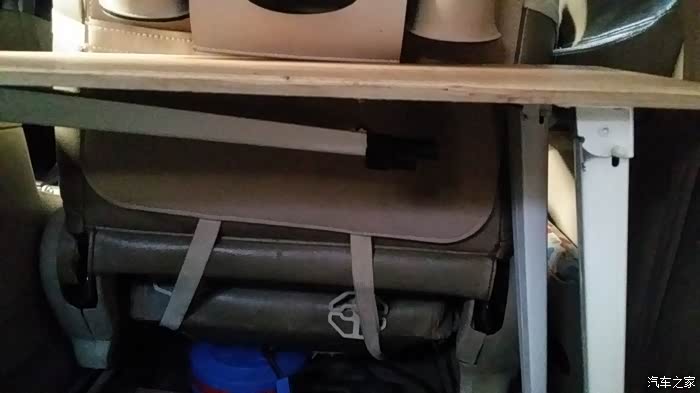 后备箱里,我在网上定做了一块带脚的木板,高度与后座折叠后的高度差不多,空间上把后备厢空间分成了上下两层。上下层平时都可以用来放东西,上层当床时东西转移到别处。这大木板的四个脚是用镀锌管开牙,旋在固定在木板底面的四个底座上的。必要时,这块板也可以来出车外当桌面。
