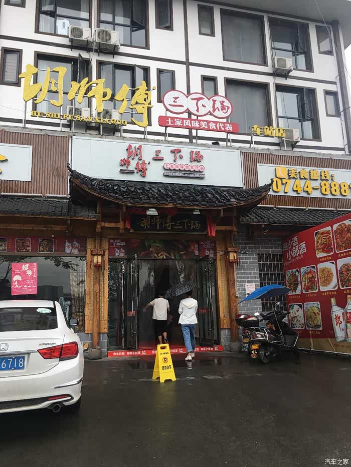 D7 (2019年7月12日):预报今天大雨,我们睡到了九点,做一下休整。吃完早餐,10:00刚过去了黄龙洞,雨越下越大,不过逛溶洞影响不大。黄龙洞洞中有洞,洞中有河,由石灰质溶液凝结而成的石钟乳、石笋、石柱、石花、石幔、石枝、石管、石珍珠、石珊瑚等各种洞穴景观遍布其中,琳琅满目,无所不奇,无奇不有,仿佛一座神奇的地下“魔宫”。黄龙洞拥有高阔的洞天、幽深的暗河、悬空的瀑布、密集的石笋,因其“规模最大、内容最全、景色最美”而被中外地质界权威人士公认为世界溶洞的“全能冠军”。值得一去!15时许到达天门山索道下站附近客栈(闲山甲居),此行中找的最吃力的客栈,因为居陋巷而无法找到入口!好在老板出来带路。终于到了,稍做休息,去吃了中央电视台特别报导过的美团评价也不错的胡师傅三下锅,六种肉任选三种,我们选了核桃肉、腊肉、肥肠,配菜尖椒和土豆,还有蒜蓉油麦菜和长炒豆角,送了开胃小菜和酸萝卜,三下锅的火一点,听着滋滋的油声,再下入白菜,好吃!果然名不虚传。
