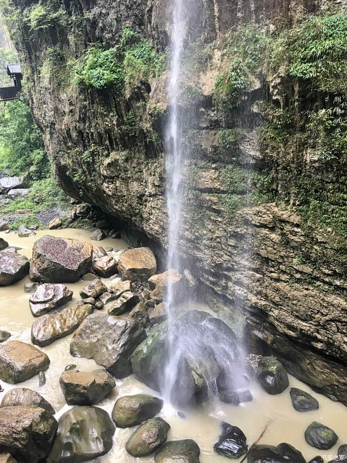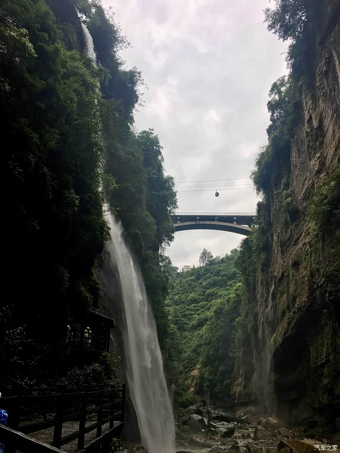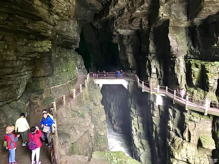 D3(2019年7月8日): 由于住在市中心,虽晚上稍吵,但吃饭很方便。7:30离店觅食,吃羊肉格格、重庆小面等,备午餐,8时许直奔今天的目的地:恩施大峡谷。10:00到达游客中心,预报的小雨如期而至,忐忑中前行。雨中游七星寨景区,乘坐国内最长电梯17分钟转乘景交车到云龙地缝。云雾缭绕,山体时隐时现,飞瀑水声潺潺,感慨大自然的鬼斧神工!其中有五大奇观:一是清江升白云。与大多数名山的云海显得闲散无序不同的是,沐抚大峡谷里从清江上升起的云海象一条腾飞的巨龙,蜿蜒曲折,延绵百里,形态丰润,美不胜收。二是绝壁环峰丛。喀斯特地貌一般情形是有绝壁者无峰丛,有峰丛者无绝壁,沐抚大峡谷不仅兼而有之,而且面积大、品位高。有四面绝壁凹陷于丛峰之中的,也有四面绝壁突出似凌架于丛峰之上的。有人说世界上目前尚未发现类似奇景。三是天桥连洞群。洞穴群落是大峡谷中又一特点。据不完全统计,大峡谷沿线有大小洞穴200余个。如板桥的热云洞,有石壁相隔形成两个洞口,一洞通热风,一洞出冷风,冷热交融烟雾缭绕;而且洞内的大厅可容纳数万人;更有天桥匹配,水天相谐、人物相映,犹如仙境。四是地缝接飞瀑。恩施大峡谷内的云龙河地缝全长7.5千米,最深达75米,地缝怪石遍布,五彩斑斓,古木苍翠,碧流潺潺,尤其是地缝两岸的数条飞瀑流泉,令人震撼而神怡。五是地缝配竖井(天坑与地缝相通)。中法探险队历经十年考察于最近宣布,奉节龙桥河至恩施大峡谷的地下暗河全长50千米,为世界之最。仅暗河之上的竖井就有108个,形似著名的新疆坎儿井,大峡谷被专家誉为与美国科罗拉多大峡谷难分伯仲,是世界上最美丽的大峡谷之一。 峡谷中的百里绝壁、千丈瀑布、傲啸独峰、原始森林、远古村寨等景点美不胜收。