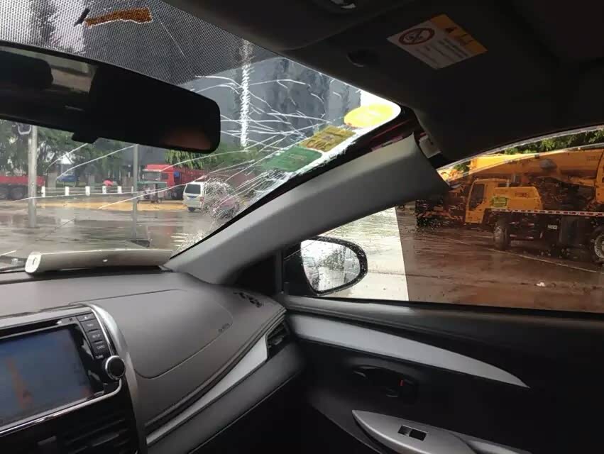 正当我开始嫌弃它的时候,老天赐予了我一个换车的好理由,一场台风把车顶盖、前风挡全干穿了