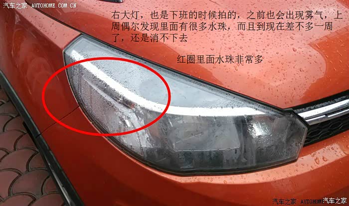 这张图同样取自车友的帖子,可以明显看到灯内甚至有大颗的水珠出现,越往上,水珠越大个,这是因为水被蒸发,开大灯,或太阳晒,就变成水汽上升,到大灯顶部被大灯灯壳“冷却”,然后凝结成水珠。上图中我们甚至能看到夸张的水从上往下流下来的痕迹。