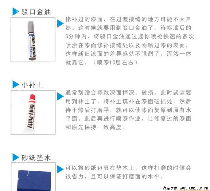 如何使用补漆笔和自喷漆的方法介绍得不多,遂就手拮取来图文,以飨需者。。