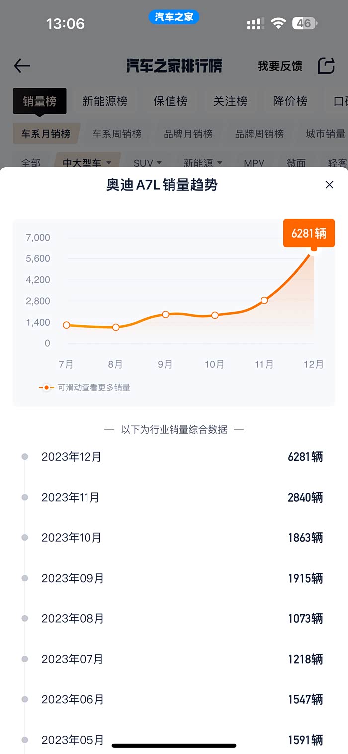一月的风又吹起安详的落叶,年关将至,2023年又在眨眼间度过。燃油车市场在过去一年无疑渐进寒冬,高歌猛进的国内外新能源汽车品牌不断蚕食燃油车市场,以至于连保时捷与BBA尚不能守住价格的最后壁垒,传统豪华车品牌的二手市场更是多次崩盘。如此满目凄凉的现状下,上汽的A7L却一改往日之颓,在2023年12月以同比增长近2000%,环比增长超100%的6281辆的销量,坐稳中大型车销量磅的第六把交椅。这样的销量与奔驰E级的销量仅差1000辆左右,虽然E级处于该代产品末期,但新生的A7L在销量上从未与E级如此接近过。