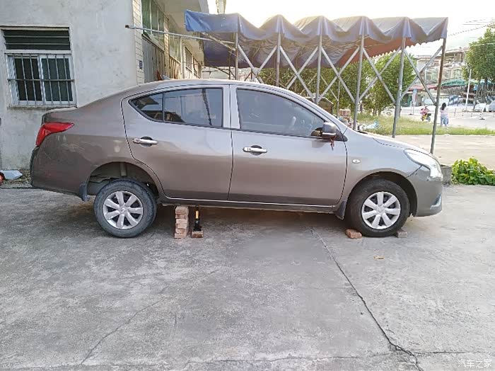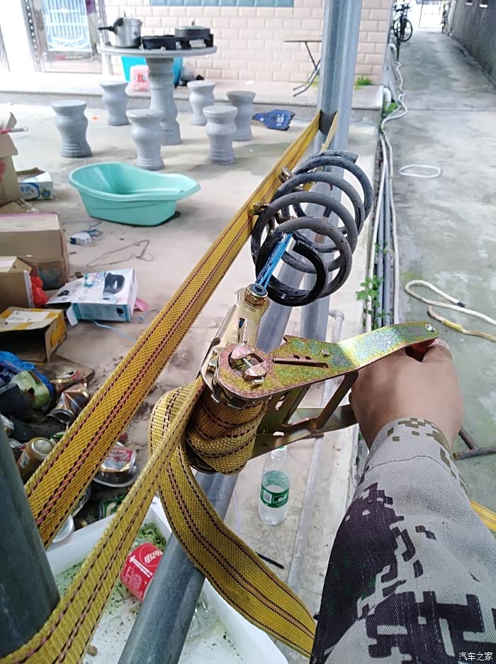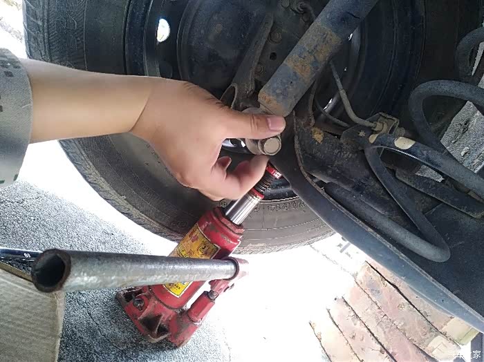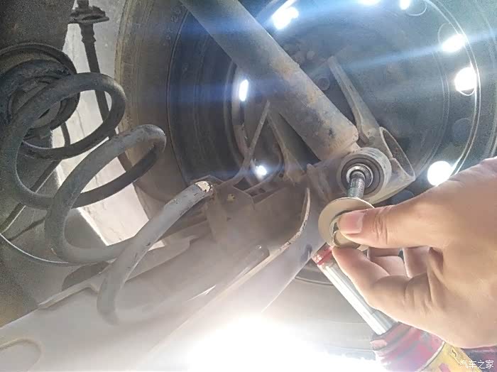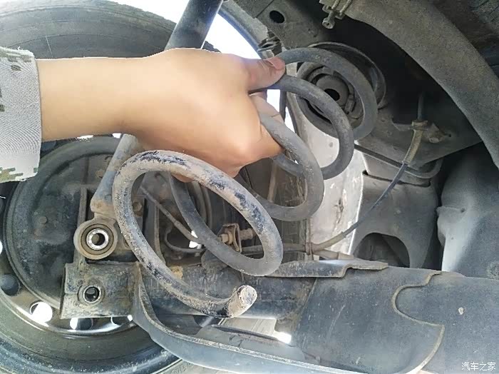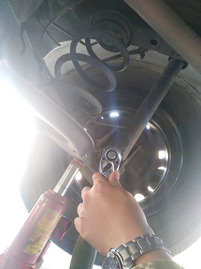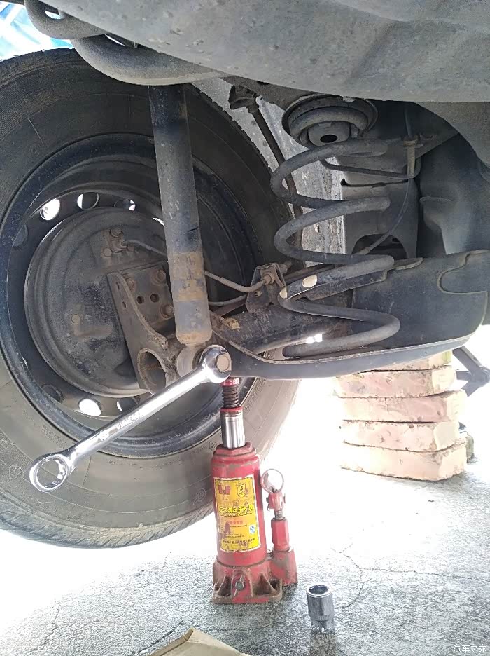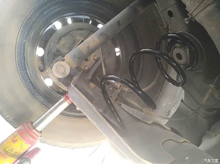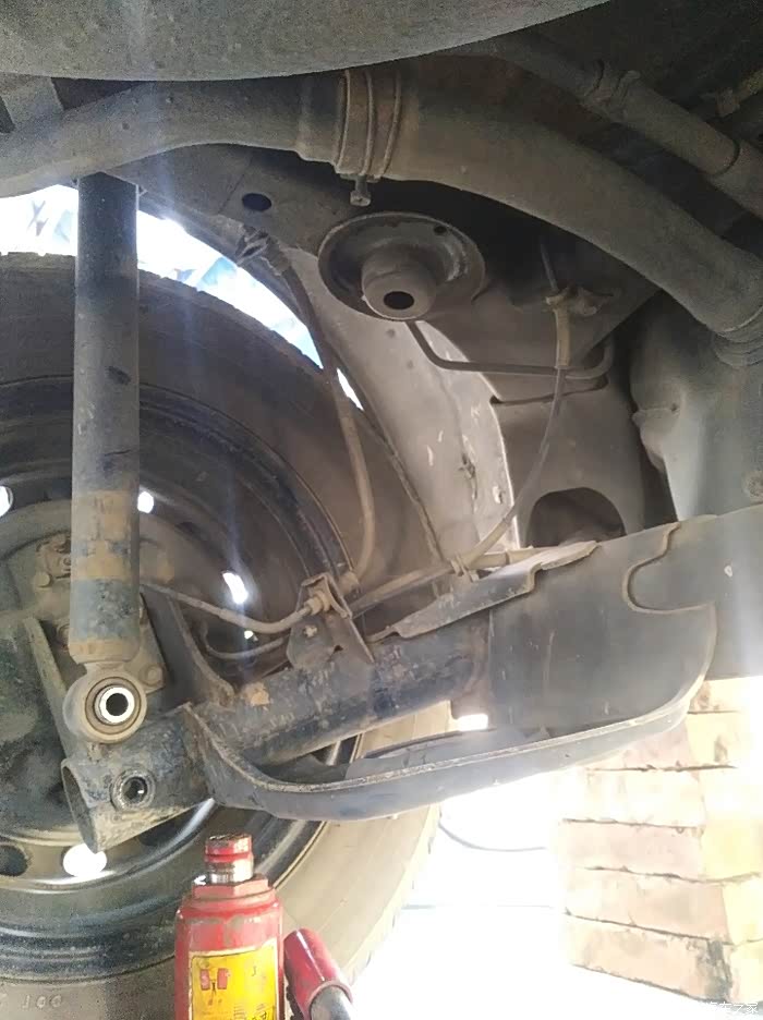 松开左右减震螺丝,降下扭力樑千斤顶取下弹簧
