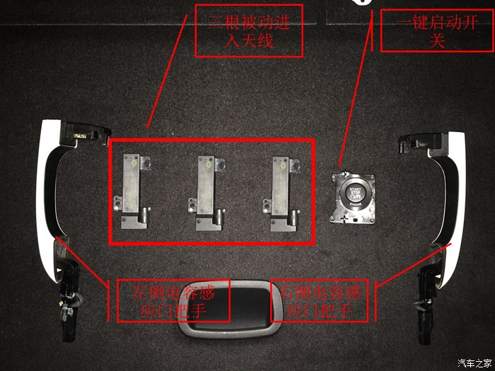 一键启动和无钥匙进入系统额硬件主要包括,左右侧带电容感应开关门把手,3根被动进入天线(安装位置分别为左右后门内饰板内和仪表中央通道内)、一键启动KLIN开关。