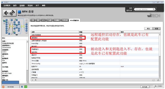 WITECH进入RFH模块ECU详细信息菜单下的配置下查看,远程遥控启动、被动进入、无钥匙启动是否为“存在”状态,如果均显示“存在”那就说明以上程序设置正确,此车将具有远程遥控启动、一键启动、无钥匙进入三大功能。