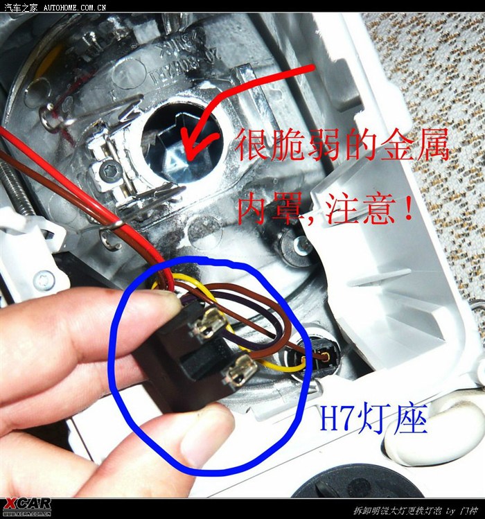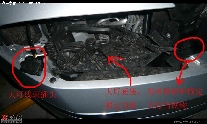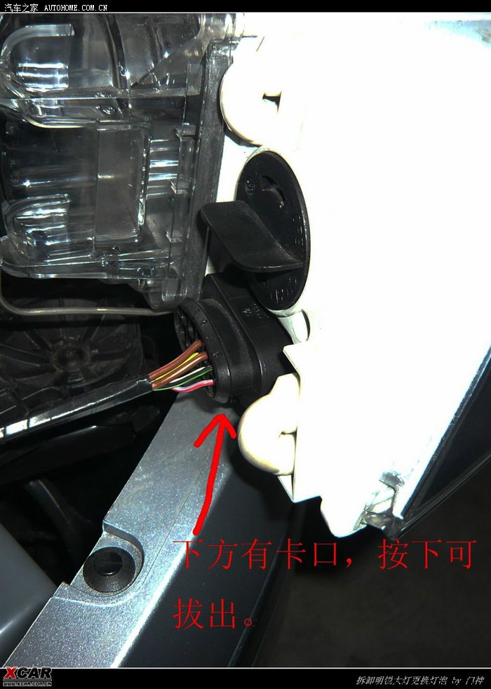 大灯卸出之后,你会发现会面被大灯的线束拖住了。大灯线束是通过卡口固定的,用手摸接头的下方,能找到扣子,按下去就可将线束退出,注意不要用蛮力,可能会拉坏线的,摸索一下很容易就拿出来了,结构跟电脑里的电源接口差不多。