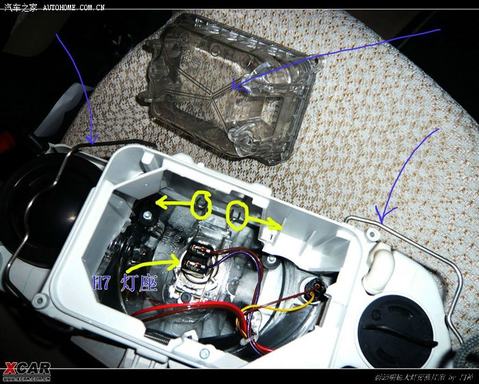 拆下大灯之后,找个稳妥的地方放好,就可以去观察一下大灯的底座,及其固定方法