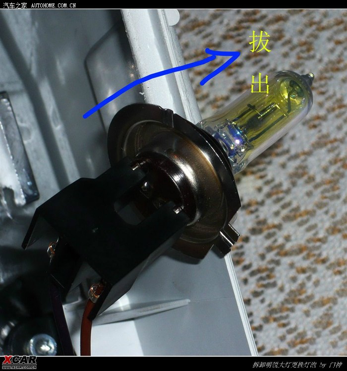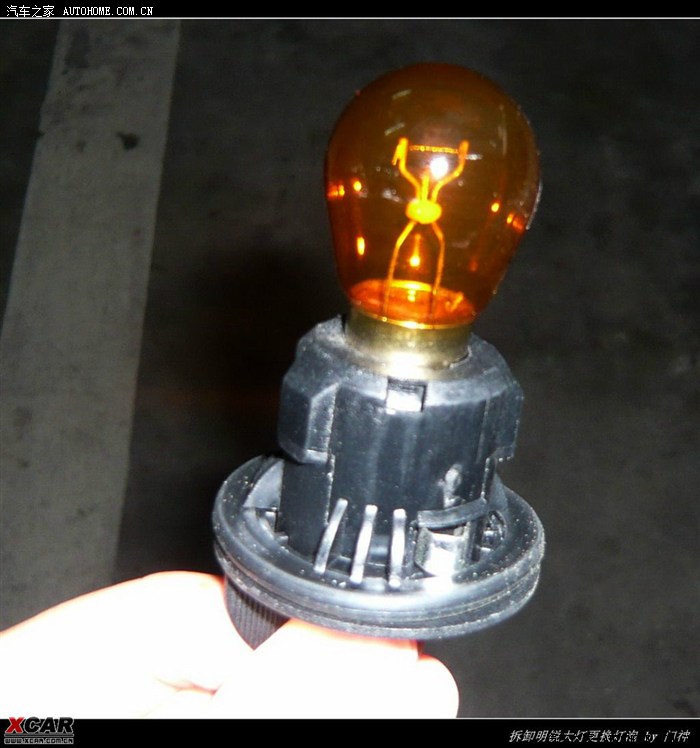 近光灯取出来了,就是这个样子,很简单,把灯泡从插座上拔出来即可,注意最好不用手指去摸玻璃,如果留下指印后会影响灯泡的寿命。