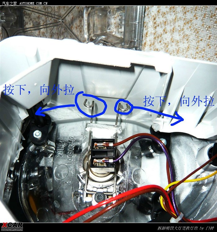 要取下灯泡非常简单,灯座由两根弹性钢丝压住固定,压下钢丝的两端向外拉出,灯座就送下来了。