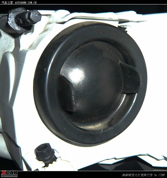 在大灯的背后,有一处用来锁定大灯的塑料螺丝。