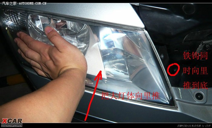 然后把灯体跟灯底座平行摆放,插好线束,并滑入,快滑到底的时候,要同时用手推灯罩,并且同时把铁钩向里推,到位之后是可以感觉到的,用语言不好说,反正很容易感觉到位了。