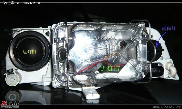 现在来看近光灯,近光灯的背后是个透明的大罩子,用两跟钢环扣住来固定的,向左右两边提起拉下,就可以把罩子轻松取下。