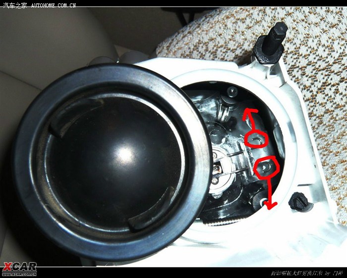 首先旋掉大灯背后的两个塑料螺丝,存放好。