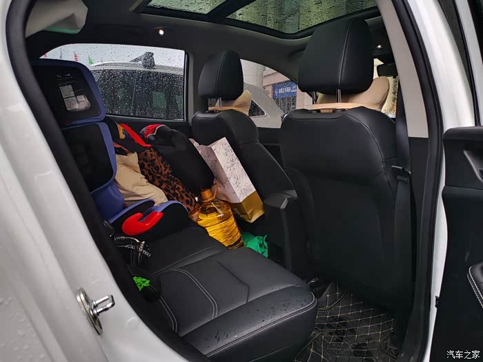 在找那桶油?嗯,说放脚底下,就放脚底下。新能源车不像油车,传动轴占了后座很大的空间,这个空间很平整的。